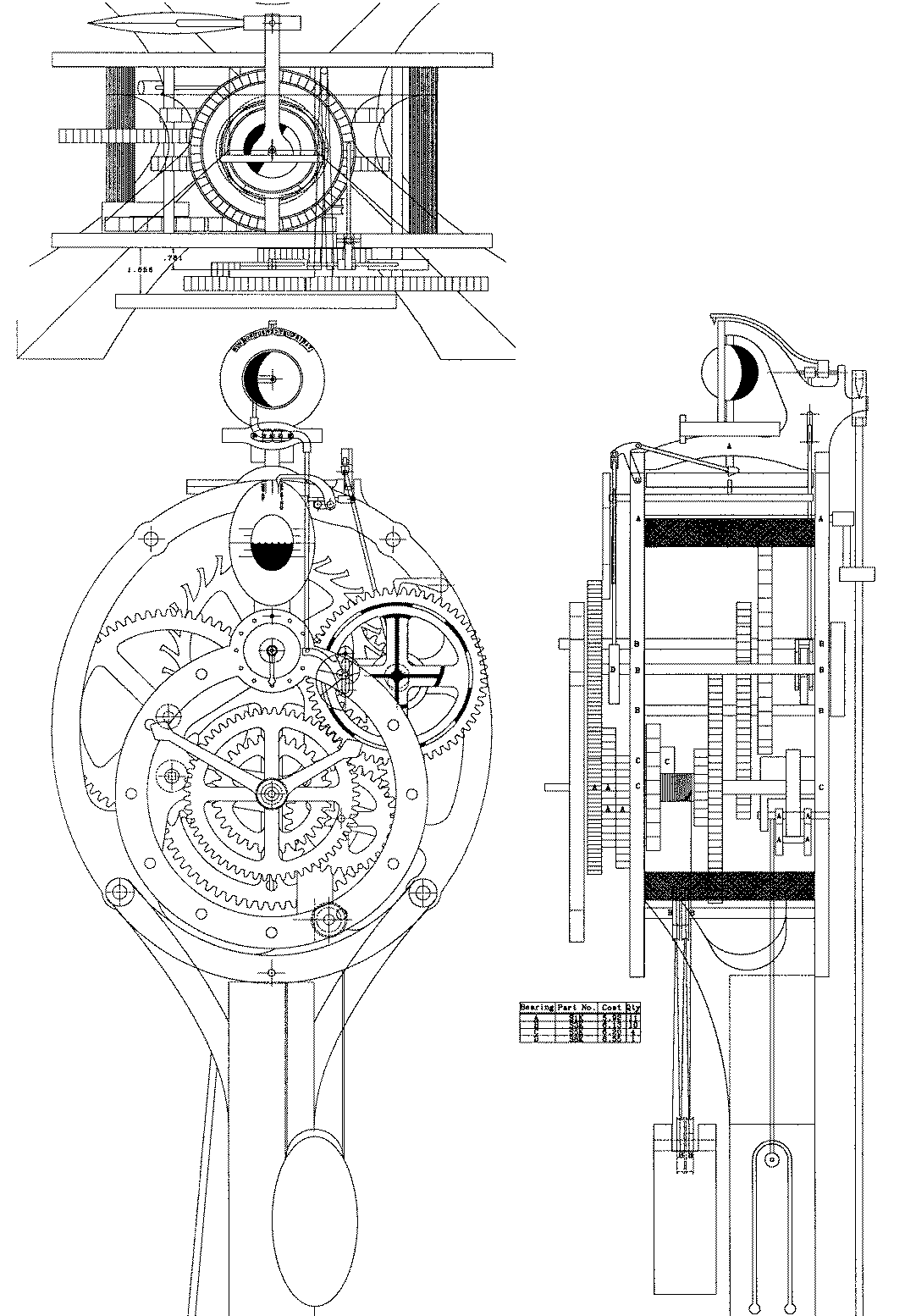 I also added another wheel, a spiral and linkage at the back of the clock which is used to indicate the day of the week. This is indicated at the top of the clock on the top of the moon face. Finally another spiral was added to the hour arbor at the back of the clock. This spiral causes a hammer to be pivoted to the side only to be released on the hour. The hammer falls and hits a wooden gong to strike the hour. All these extra indications were added at the slow end of the time train so as to minimize the frictional effects on the running of the clock.